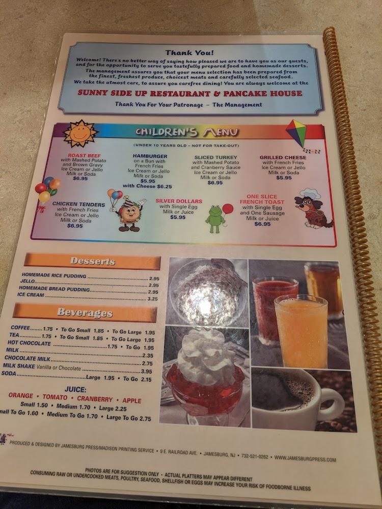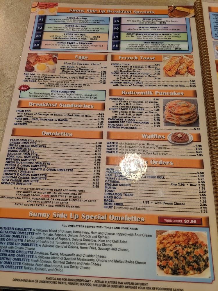 The menu at Sunny Side Up features an impressive selection of breakfast and lunch items. Guests can choose from various omelettes, pancakes, and sandwiches.